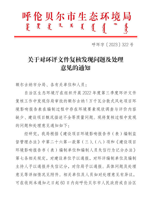 近日,呼倫貝爾市生態(tài)環(huán)境局發(fā)布《關于對環(huán)評文件復核發(fā)現問題及處理意見的通知》(呼環(huán)字2023(322)號),通知中稱,對自治區(qū)生態(tài)環(huán)境廳在組織開展 2022 年度第三季度環(huán)評文件復核工作中發(fā)現額爾古納市分局審批的額爾古納 1萬千瓦分散式風電項目環(huán)境影響報告表在編制過程中存在環(huán)境要素現狀調查與評價內容缺少、建設項目概況描述不全等質量問題。發(fā)現的問題和處理意見通知如下: